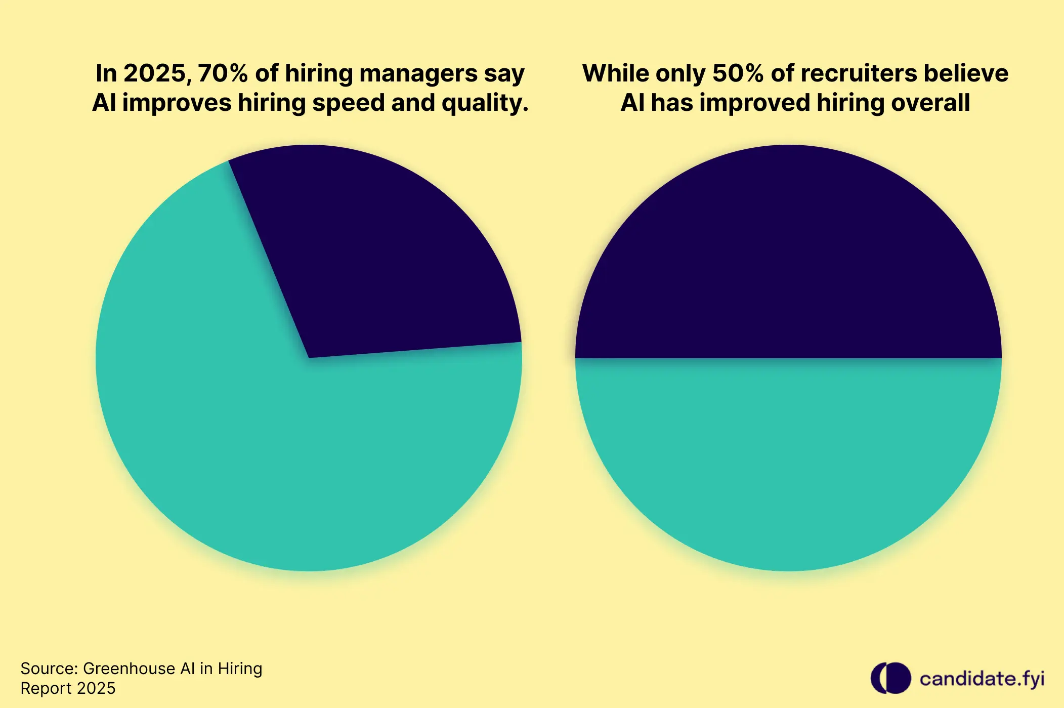 Greenhouse reports that 70 percent of hiring managers believe AI improves hiring speed, while only 50 percent of recruiters agree. This gap leads to misunderstandings around expectations and viewpoints.