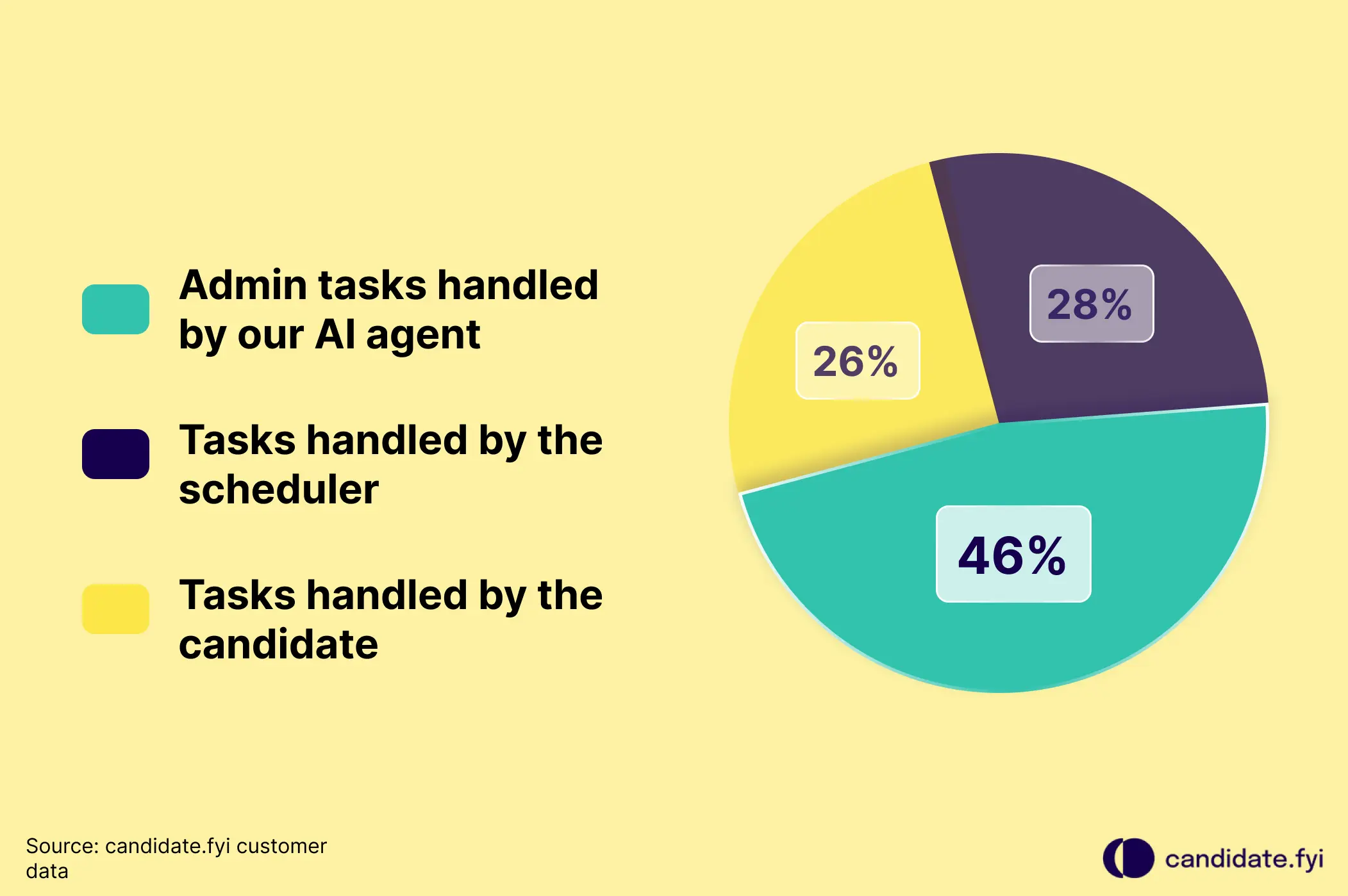 Internal data from candidate.fyi shows that the fyi AI agent handles 46% of scheduling tasks, such as confirming times and sending reminders. Candidates themselves handle 26 percent through self-service. Recruiters handle only 28 percent of the manual workload.